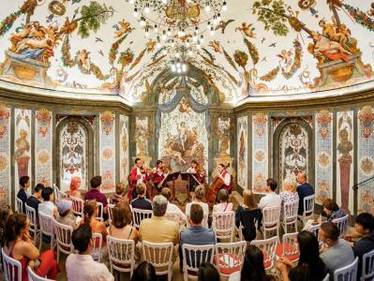 Im Stil der venezianischen Spätrenaissance gehalten, zeichnen sich bereits deutliche barocke Einflüsse ab. Die wunderschönen, illusionistischen Fresken in der Sala Terrena zeigen reiche Ornamentik sowie Szenen aus der Mythologie.Dieser ausgewählte Festsaal bildet einen exzellenten Rahmen für einen Musikabend höchster Qualität.